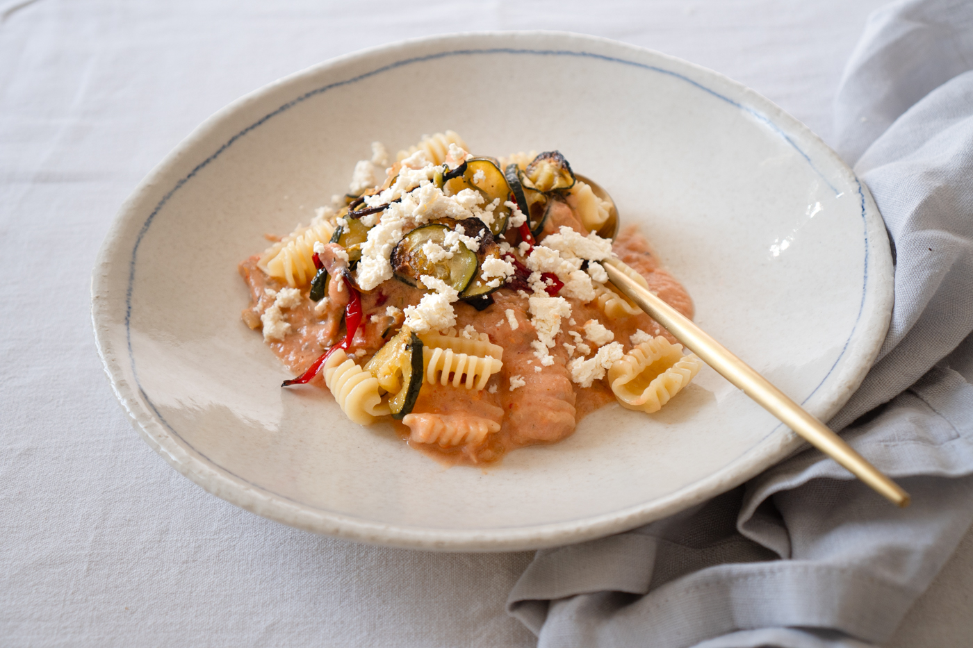 Dann den Seidentofu, den Bröseltopfen und Honig zugeben – alles mit dem Pürierstab glatt mixen. Das geröstete Ofengemüse zugeben – ein wenig als Deko zur Seite legen.